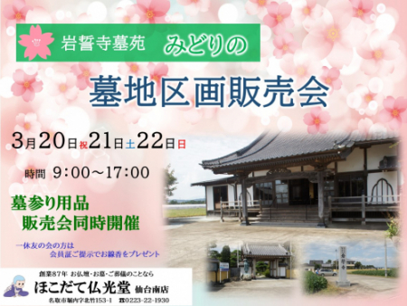 | 販売会のお知らせ | 皆さん、こんにちは 墓地区画販売会のお知らせです。 今回は春彼岸中の開催となります。 日時 2020年3月20日(金)~3月22日(日) 9:00~17:00 販売会とあわせて、 お墓参り用品の販売も実施いたします。 また、ほこだて仏光堂の友の会の方限定で お墓参り用のお線香をプレゼントいたします。 この機会にぜひご来場ください。 心よりお待ちしております。 ![]() |
